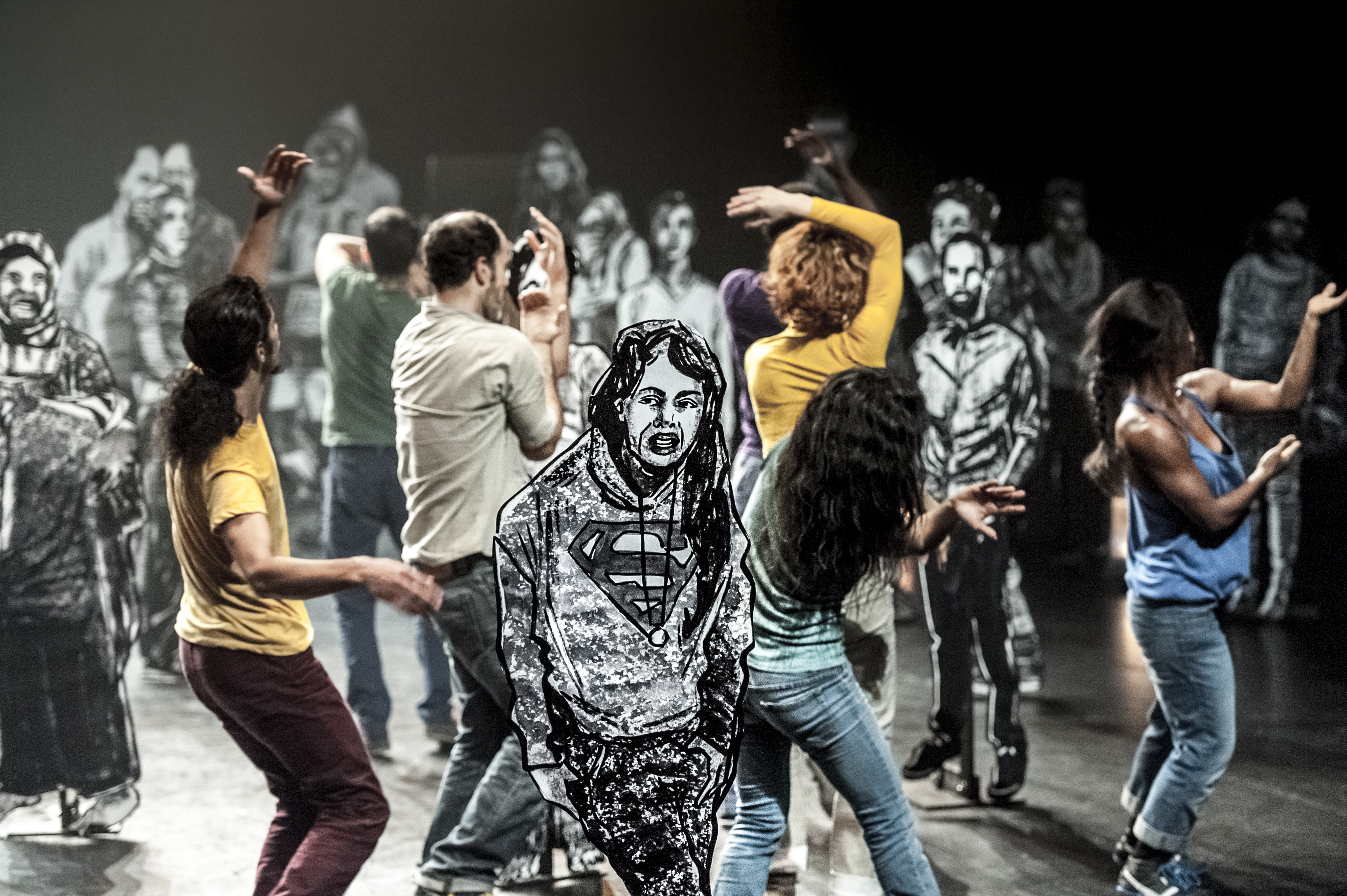 Several dancers in colourful clothes are jumping with their arms outstretched. Behind them black and white cardboard figures